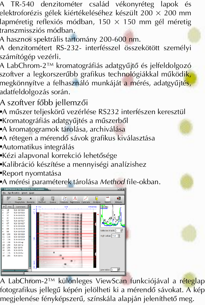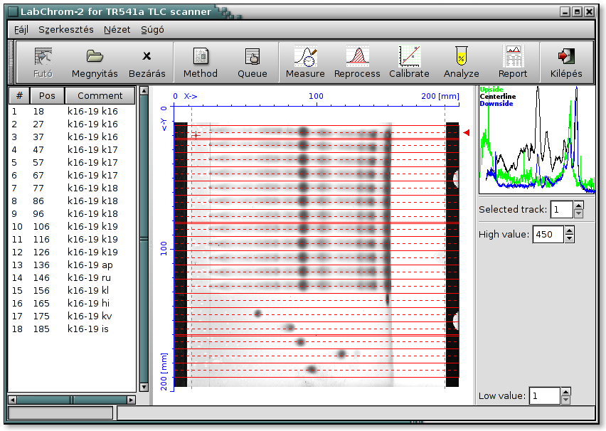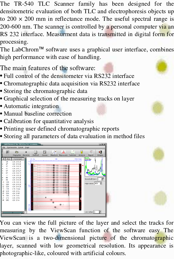 The LabChrom(tm) software uses a graphical user interface, combines high performance with ease of handling. ViewScan Picture You can view the full picture of the layer and select the tracks for measuring by the ViewScan function of the software easy The ViewScan is a two-dimensional picture of the chromatographic layer, scanned with low geometrical resolution. Its appearance is photographic-like, coloured with artificial colours.