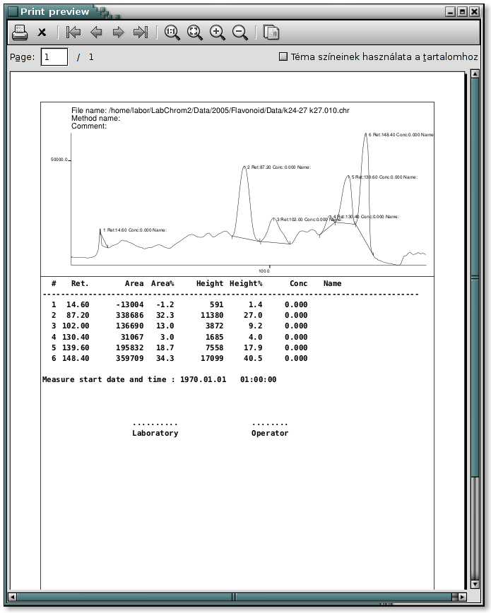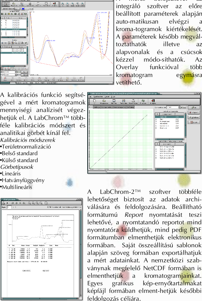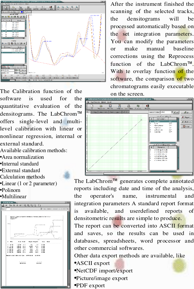 Report Picture The LabChrom(tm) generates complete annotated reports including date and time of the analysis, the operator's name, instrumental and integration parameters A standard report format is available, and userdefined reports of densitometric results are simple to produce. The report can be converted into ASCII format and saves, so the results can be used in databases, spreadsheets, word processor and other commercial softwares.