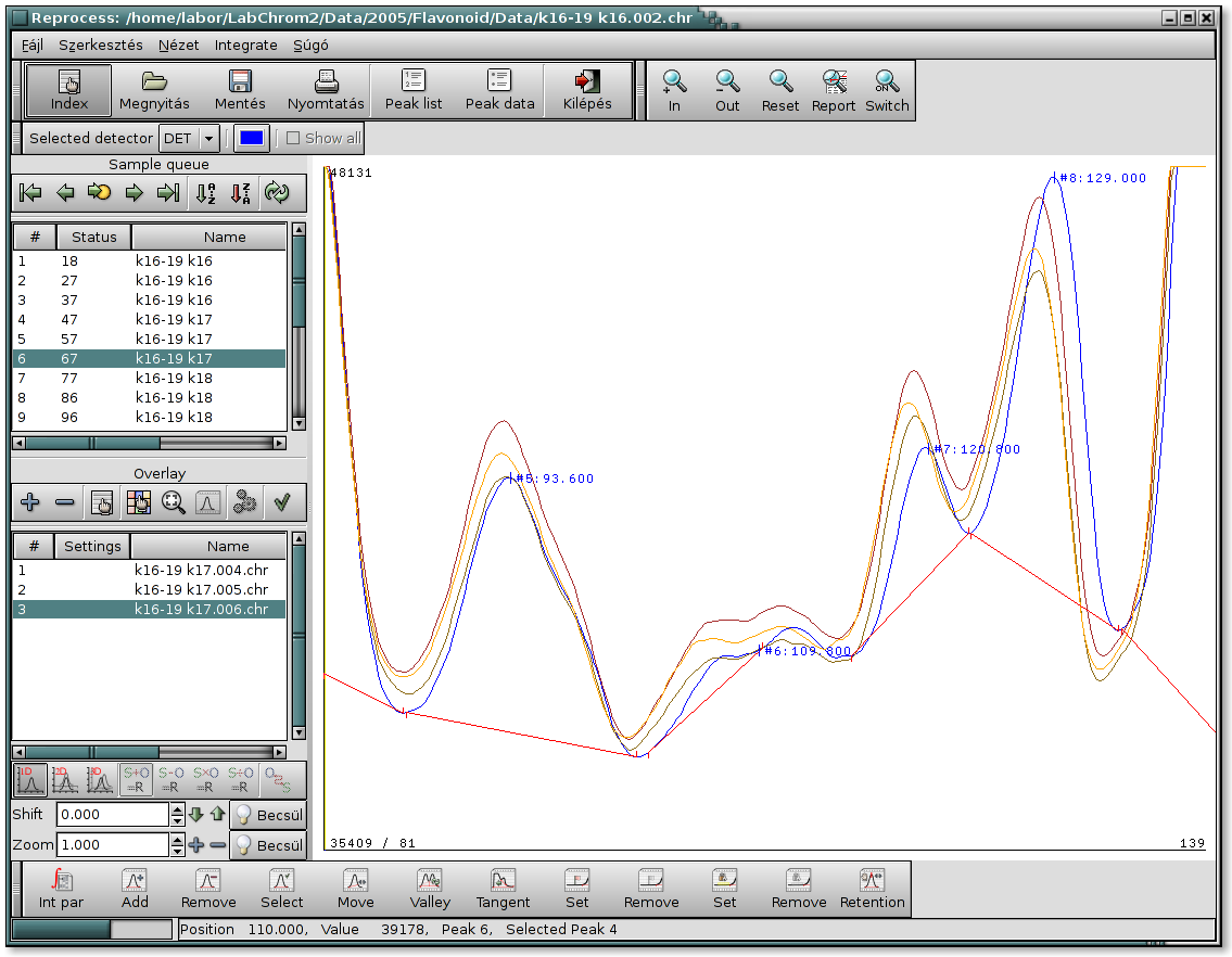 Reprocess Picture After the densitometer finished the scanning of the selected tracks, the densitograms will be processed automatically based on the set integration parameters. You can modify the parameters or make manual baseline corrections using the Reprocess function of the LabChrom(tm).